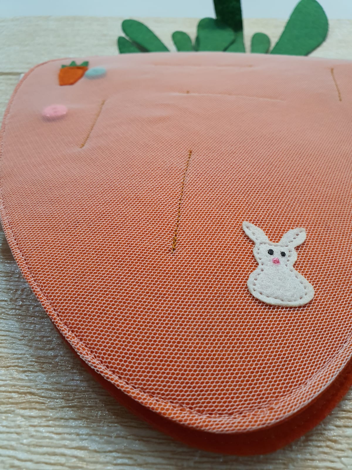 On the outside of the carrot, there is a button maze activity with a rabbit at one end and a carrot at the other. Children can trace the button from the rabbit to the carrot, developing fine motor skills and problem-solving abilities in a playful way.