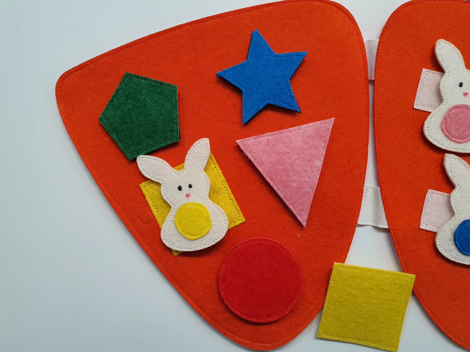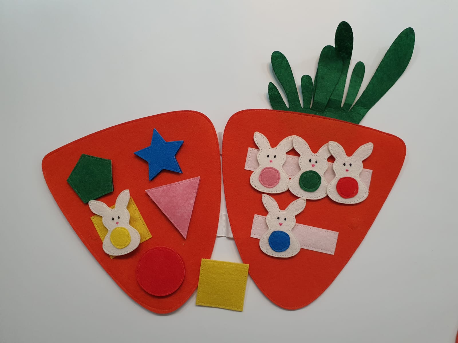 Introducing the delightful Bunny Mates - Carrot Playset, the perfect learning activity for children to explore and learn through play! Made from soft and tactile felt, this playset features a carrot-shaped base with five colorful shapes: square, circle, triangle, pentagon, and star, each with a corresponding cute bunny rabbit in matching colors.