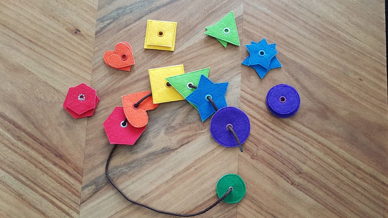 Shape Lacing Activity Set - Featuring 6 different shapes in 6 vibrant colors and 3 different sizes each, this set comes with a lacing thread to help teach your child about colors, shapes, and sizes. The sizes of the shapes range from 1.5 inches to 2.5 inches, making them easy for your child to hold and grab.