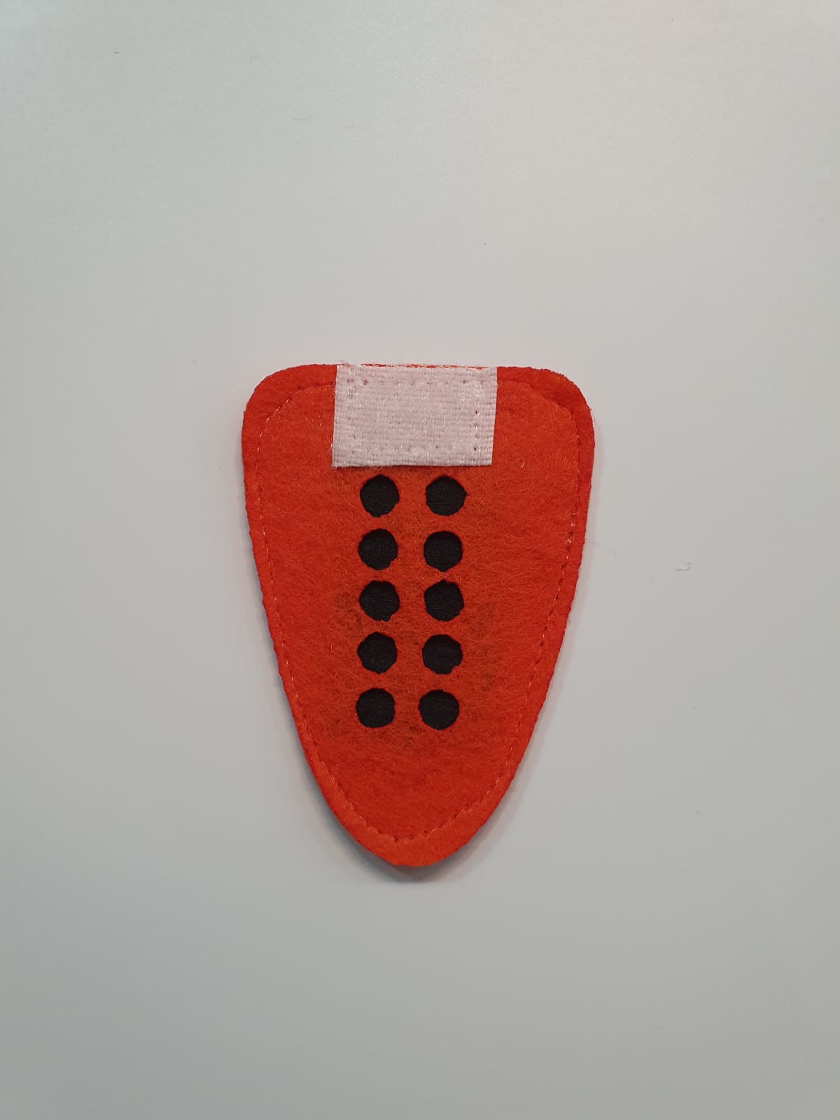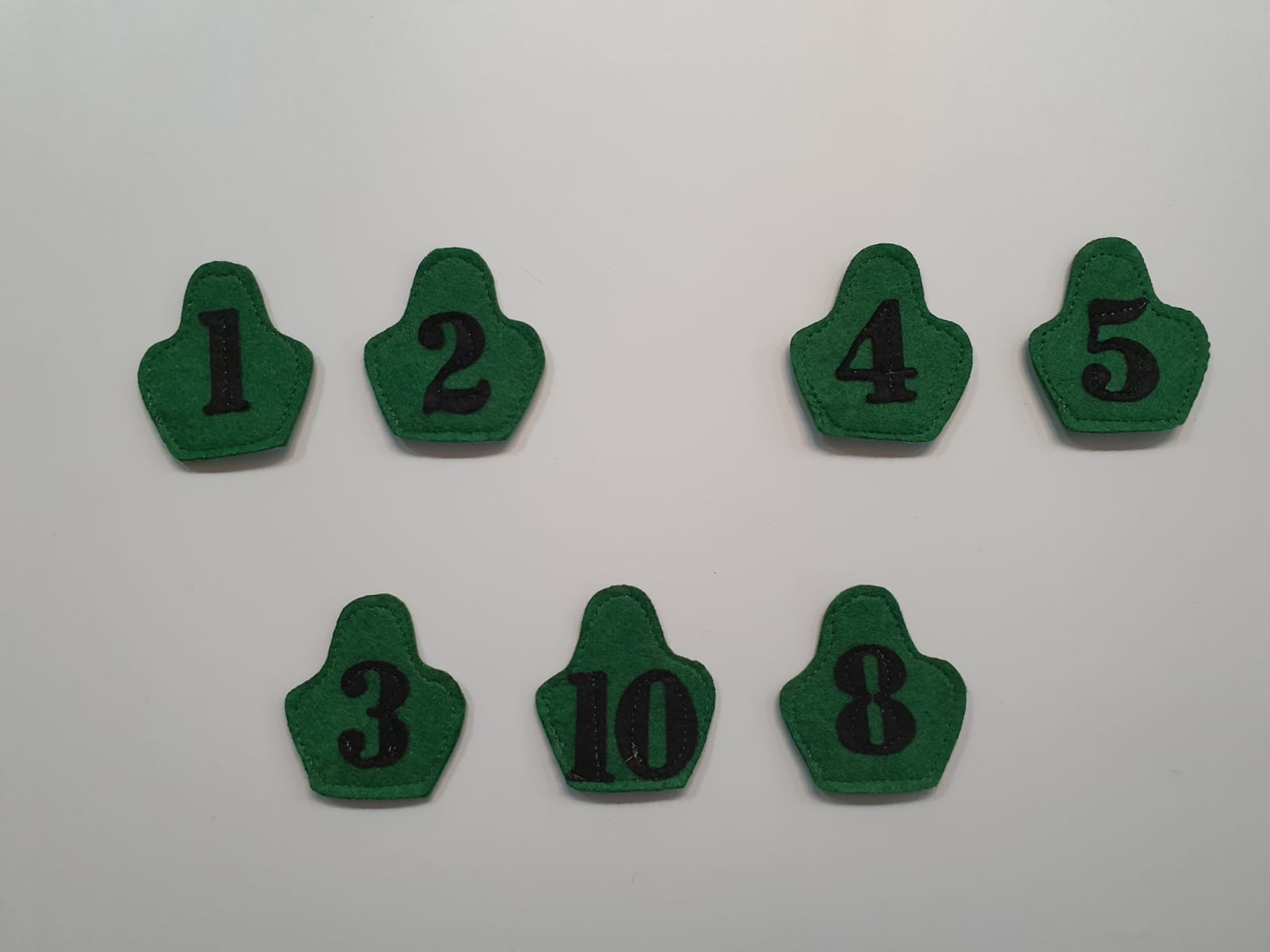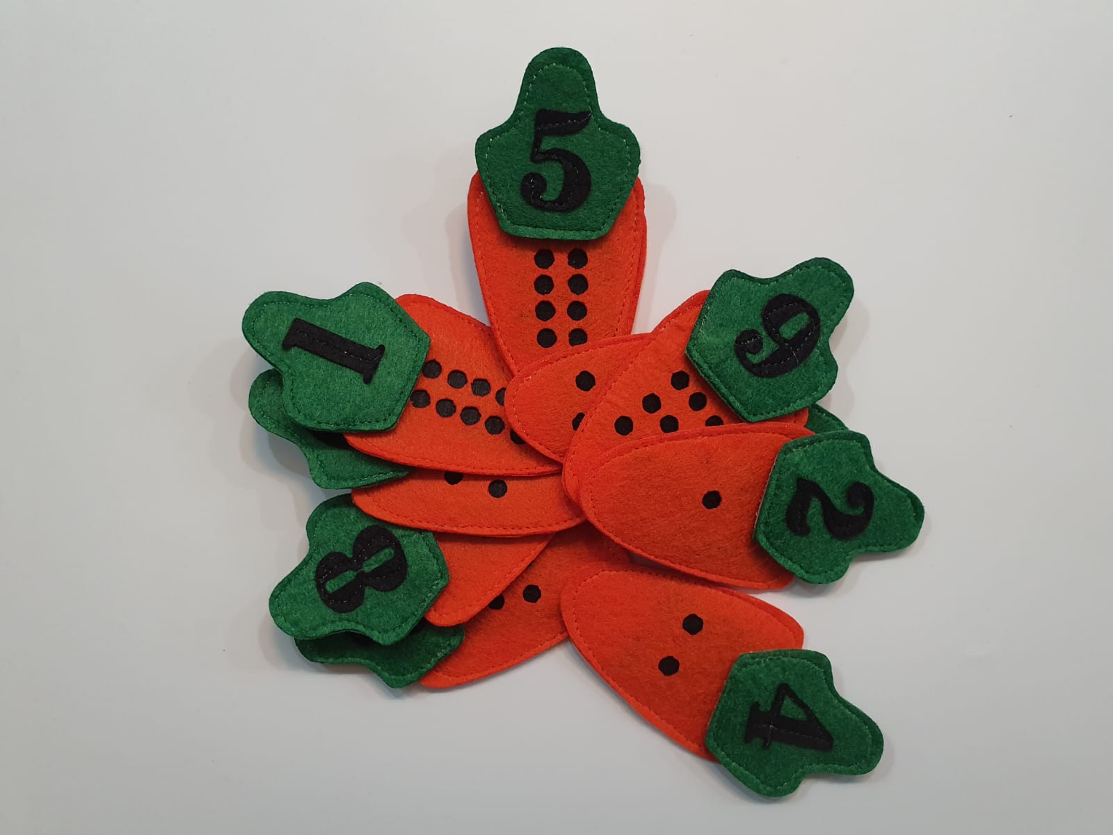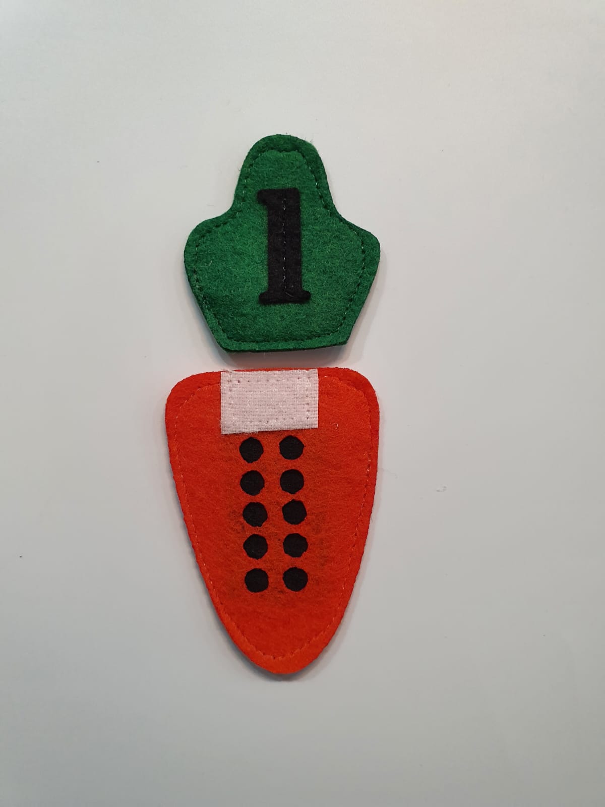 Introducing the adorable Counting Carrot Stem, the perfect learning activity for young children to practice counting and number recognition in a fun and interactive way. Made from soft and durable felt, this activity set features a green carrot stem with ten carrots attached, each with a different number of dots and the corresponding numeral printed on top.