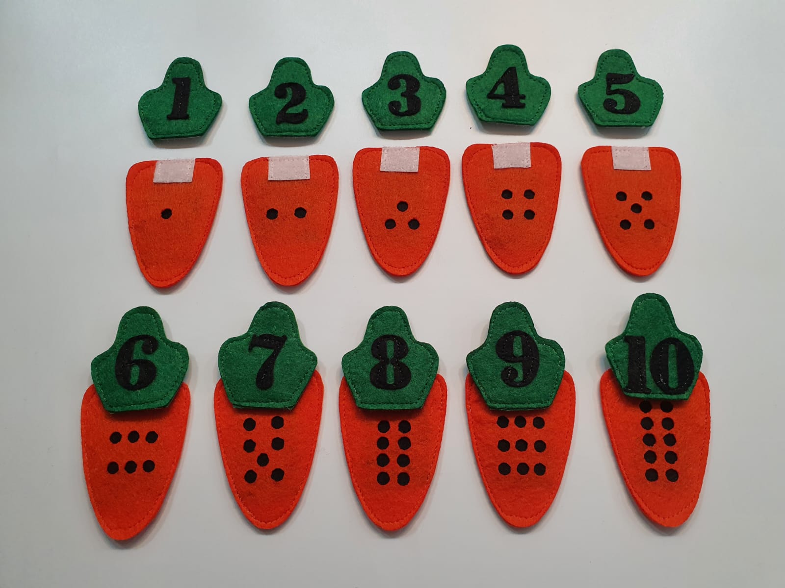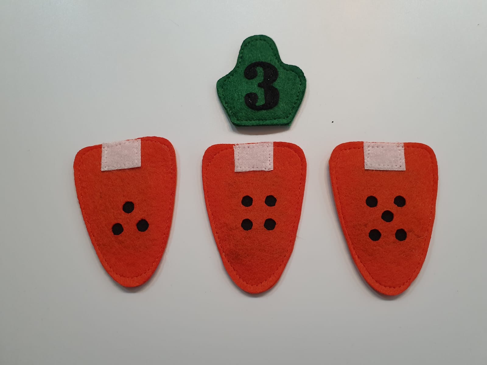 Or, place three carrots with different numbers of dots and one stem with a specific number, and encourage your child to find the carrot with the same number of dots as the stem.