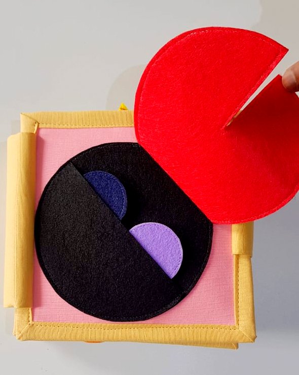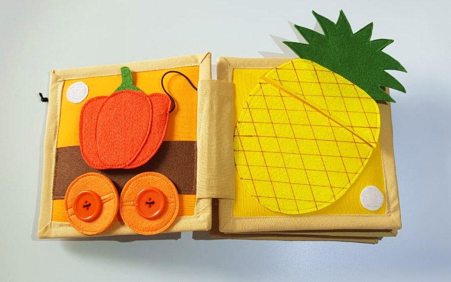 2nd Page- Yellow Color- Cut the pineapple in half. The pineapple's half part is attached to a magnetic snap button. Learn to snap the button and rotate it up and down.