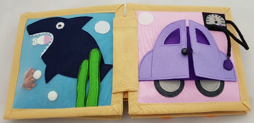 5th Page- Indigo- Feed the shark with a fish or tortoise button, name each button, or count buttons and feed your shark. The moving buttons help improve hand-eye coordination.
