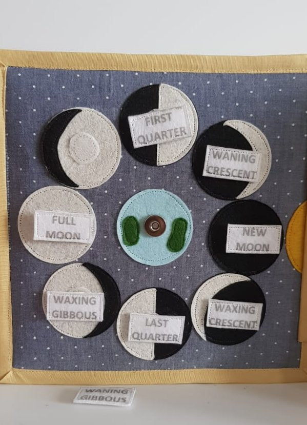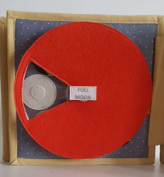 3rd Page- Moon Phases- This is a different way to teach children about the different phases of moon with a moving felt Wheel.Ā