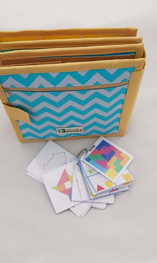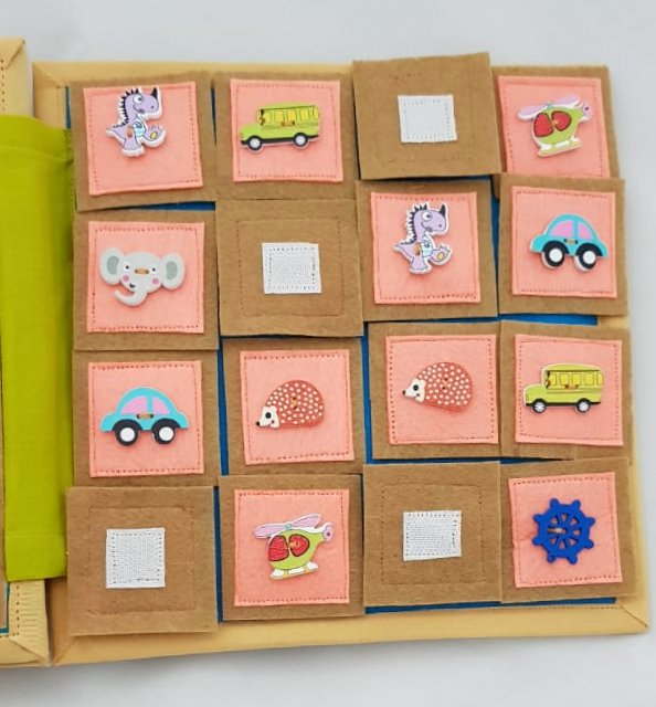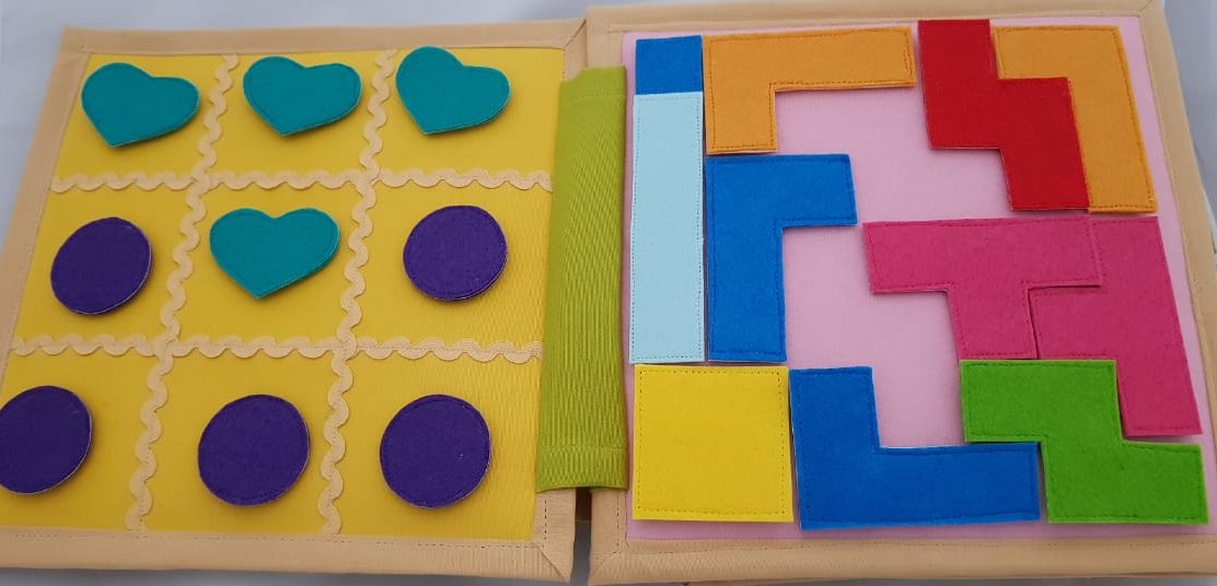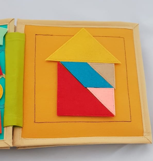 2nd PageĀ - Tetris - Reassemble the puzzle pieces on the page to create various graphics, utilizing the Velcro on each piece to attach and detach them as needed. This activity can enhance children's spatial imagination and color recognition skills. The book contains the solution to the Tetris game.
