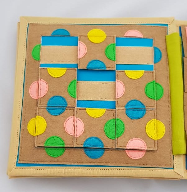 The Puzzler's Mansion Quiet Book includes 8 pages, including a cover and a back page, with different puzzle games such as mazes, tangrams, memory games, and more. Each page is made with high-quality felt fabric and designed with colorful graphics and patterns that will engage your child's senses and imagination.