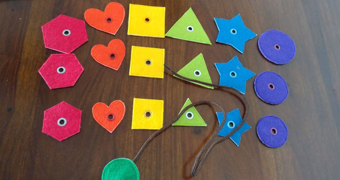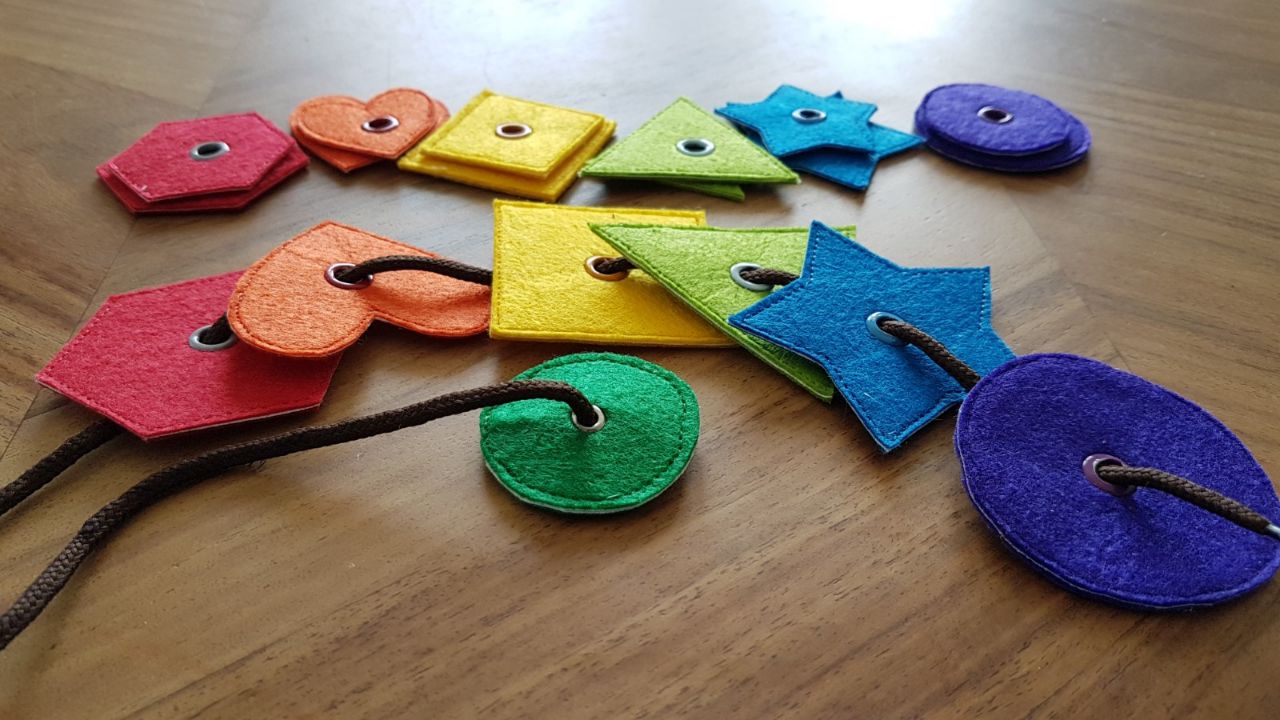 Introducing the new generation learning and development toy! This open-ended play set includes six different shapes in three sizes and colors, along with a 22cm long lace and storage pouch. Each shape has a 10mm hole for lacing activity. Made with high-quality felt, the sizes range from the largest shape at 2.5 inches to the smallest at 1.5 inches.