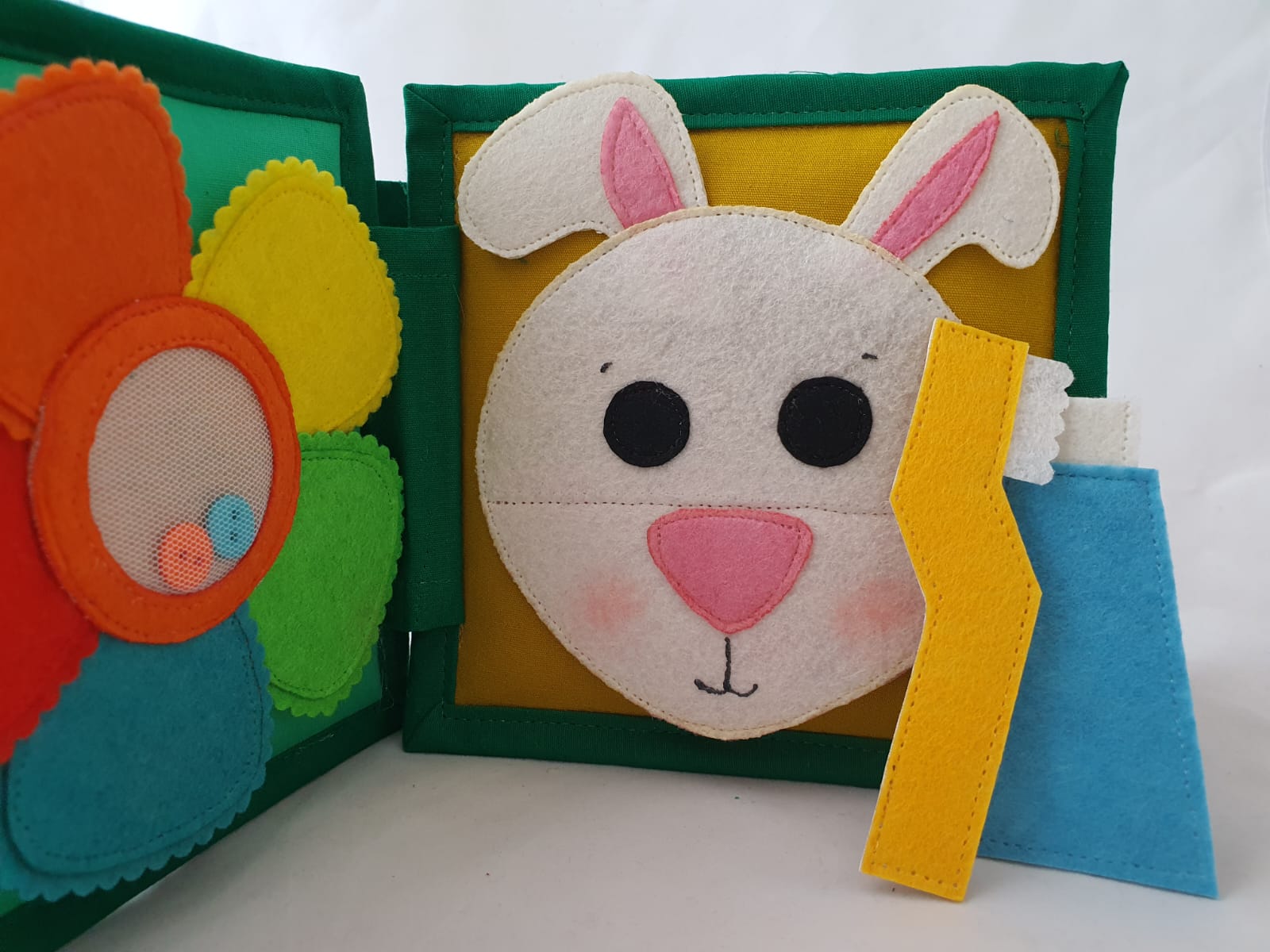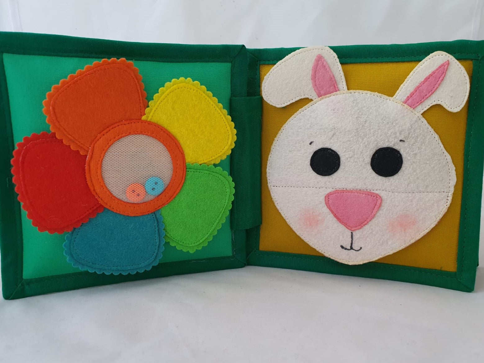 1st Page- A child can learn about Different colors . In the center , there are beads to move . Each Felt Petal have a Button Underneath to play a Memory game.