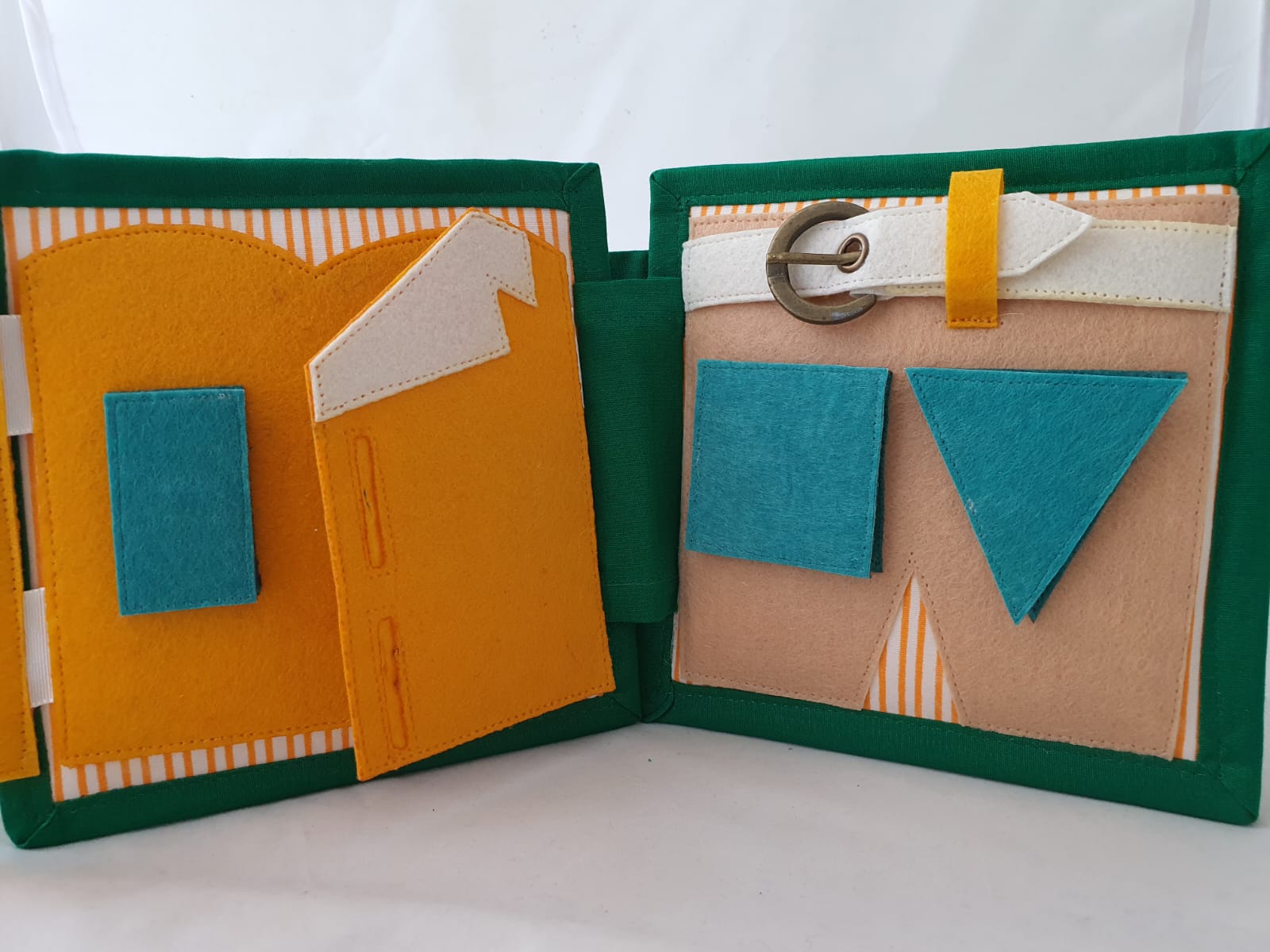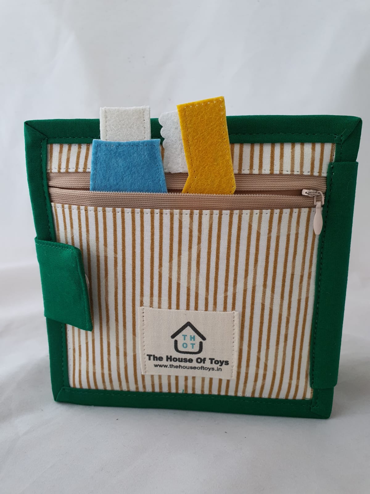This is a Mini Quiet Book 15*15 Cms. Each activity is specially designed for small aged Kids . This is made of 100% Cotton fabric , Good Quality Felt and Completely Machine Stitched.
