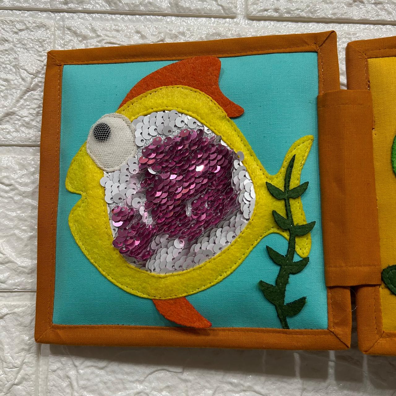 This page features a fish made from sequinned fabric, which your child can touch and move. The shimmering texture encourages sensory exploration as they interact with the fabric.