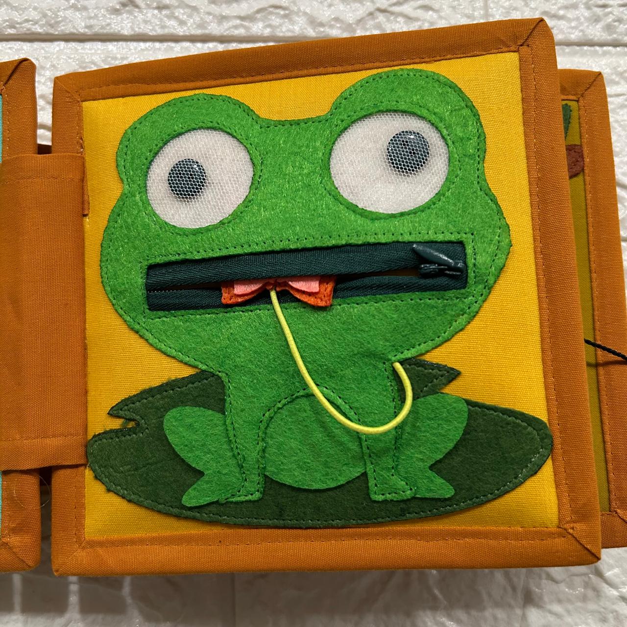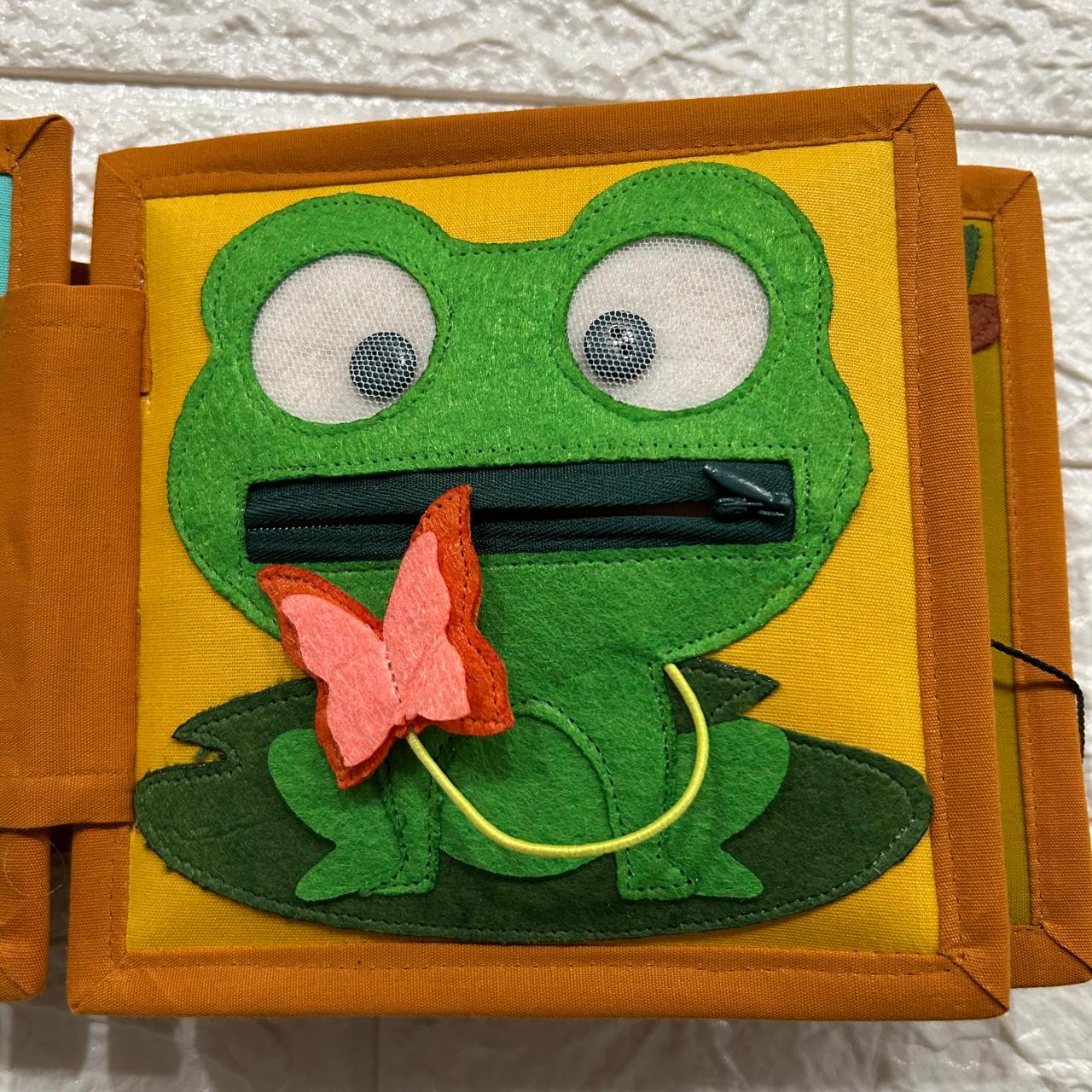 On this page, there’s a tadpole with moving eyes, along with a butterfly attached by an elastic band. The child can place the butterfly in the tadpole's mouth, where there’s a small zipper to practice opening and closing.