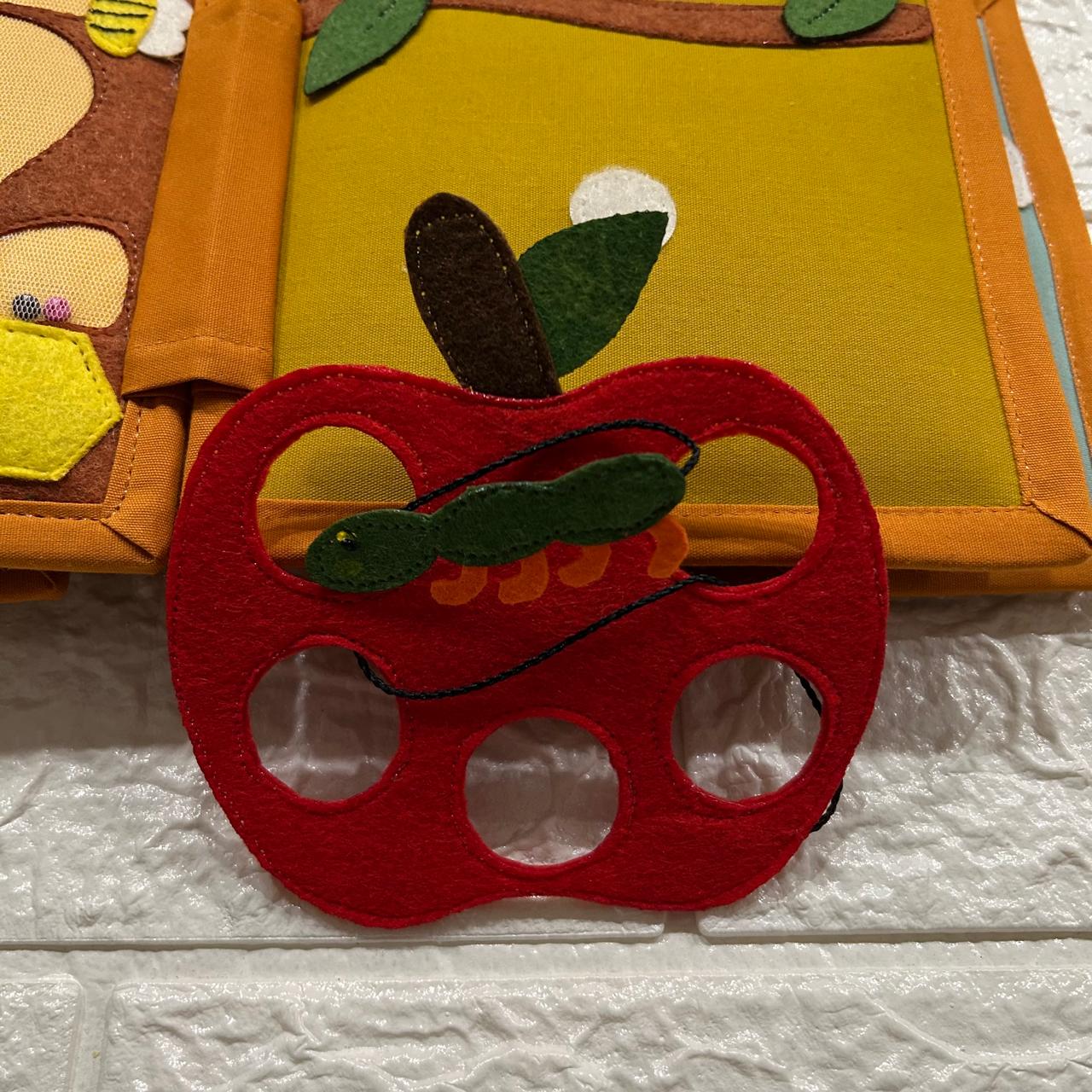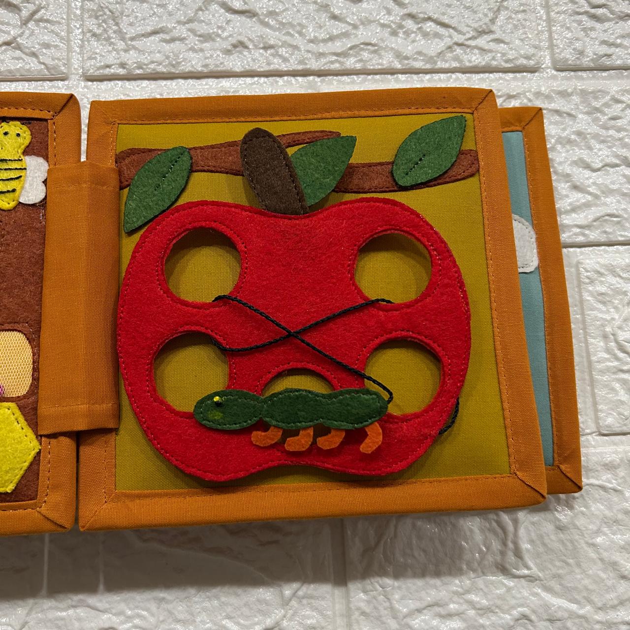 An apple is hanging on a branch, and your little one can “pluck” it. The caterpillar can be made to “eat” the apple by lacing it through the apple holes.