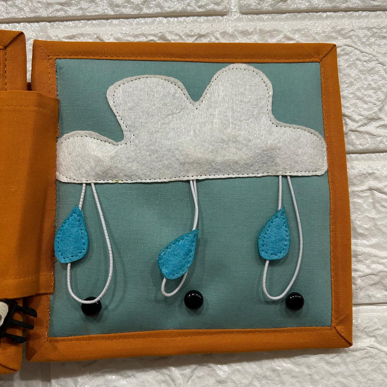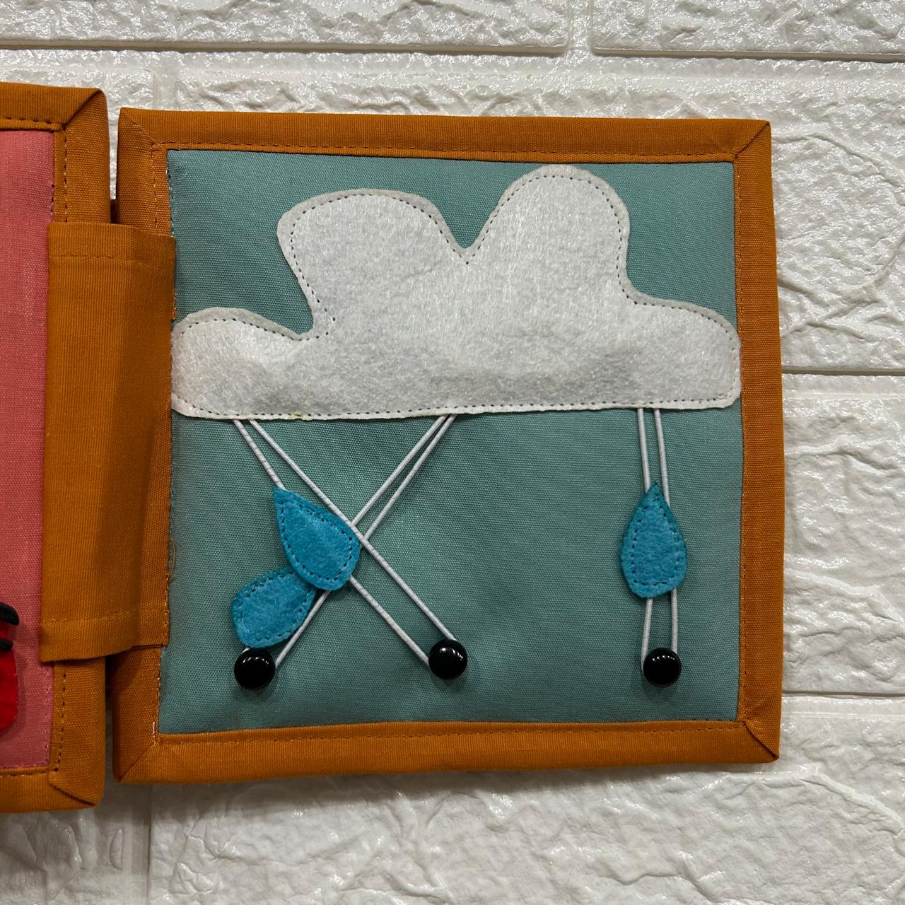 The final page features a cloud with raindrops. Your child can pull elastic cords and attach them to three buttons, improving their motor skills while enjoying the tactile experience.
