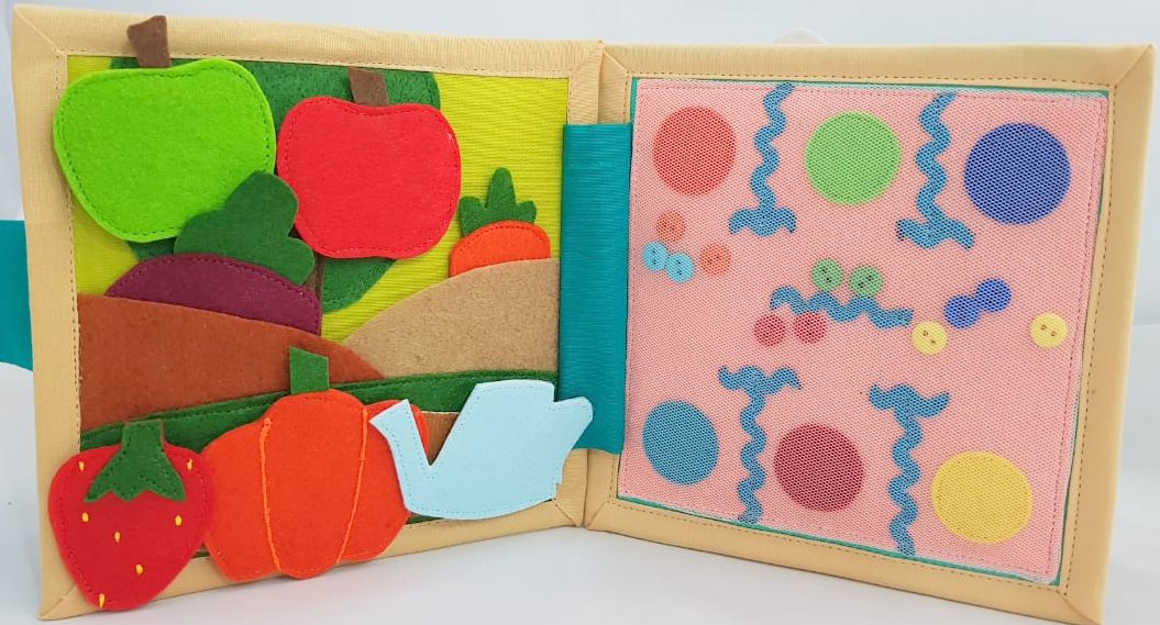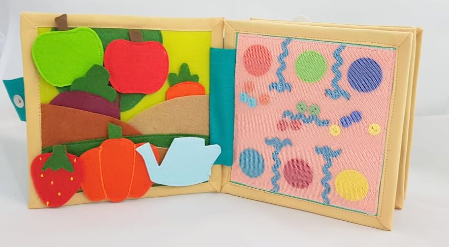 While Playing with the book A child will learn how to use different Kind of fasteners and solve Puzzles, learn about Different Vegetables & fruits, animals And Vehicles and Counting and Color Matching.